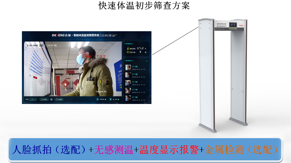 Danone electric specially developed and produced this door type infrared temperature monitor for epidemic prevention and control, which can realize the accurate matching of personnel and temperature through non-contact temperature measurement, and establish the first line of defense; it can measure temperature and metal for personnel passing the inspection, and it is a full-automatic infrared temperature detector integrating temperature measurement and metal inspection. It can quickly filter, effectively reduce the detection workload and improve the efficiency. The door type infrared temperature monitor is convenient for screening patients with fever symptoms to reduce the spread of infection and epidemic. It is suitable for the detection of human body temperature in public places such as entry-exit ports, airports, stations, docks, hospitals, organs, factories, schools, hotels and office buildings.