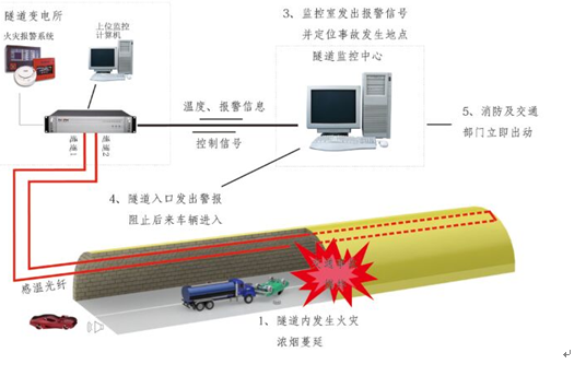 隧道是封闭的狭长空间,交通量大,通风条件差,发生火灾后烟气大而且不易散发, 容易对洞内车辆、人员和设备安全构成重大危害。光纤传感系统可以准确地探测到隧道全长范围内的温度分布情况,对隧道内的温度进行实时、长期的监测,并利用经验值根据温度情况做出合理判断,在火灾发生之前对发展情况进行掌控。当有事故和火灾发生时迅速发出警报,阻止后来车辆进入隧道,将事故损失降至最低。