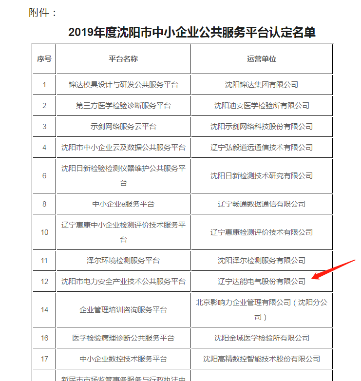2020年1月9日,喜讯传来,辽宁leyu中国电气股份有限公司沈阳市电力安全产业技术公共服务平台经过沈阳市工业和信息化局的评定,成功认定为“沈阳市中小企业公共服务示范平台”。
