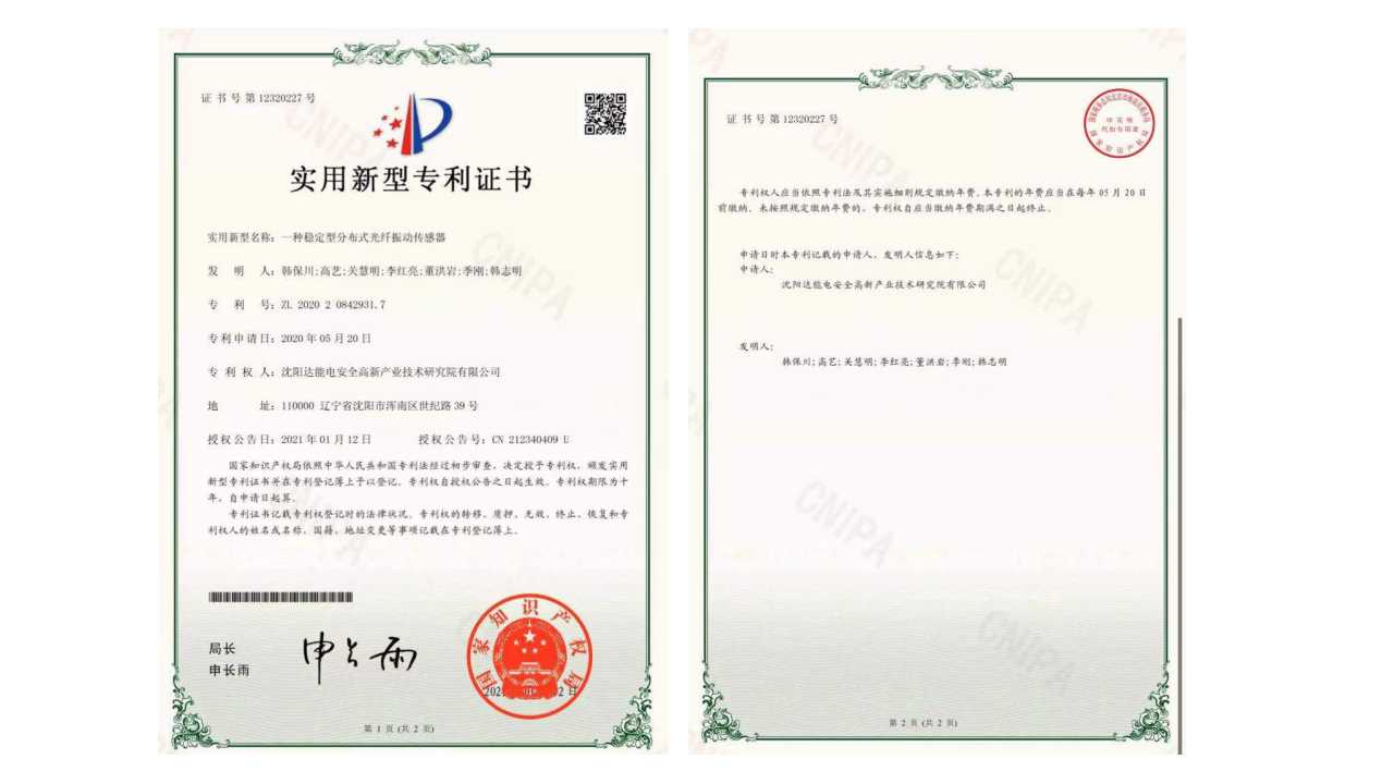 112日,沈阳leyu中国电安全高新产业技术研究院(以下简称研究院)荣获由国家知识产权局颁发的实用新型专利证书—《一种稳定型分布式光纤振动传感器》,专利号ZL 2020 2 0842931.7。沈阳leyu中国电安全高新产业技术研究院是leyu中国电气旗下研发机构,是公司重点打造的创新研发机构。2020年度,leyu中国研究院累计荣获5项实用新型专利证书、7项软件著作权证书,这是leyu中国专注研发创新,加速科技成果转化,推动知识产权战略实施的有效成果。