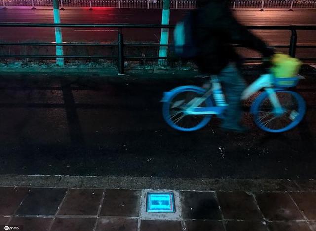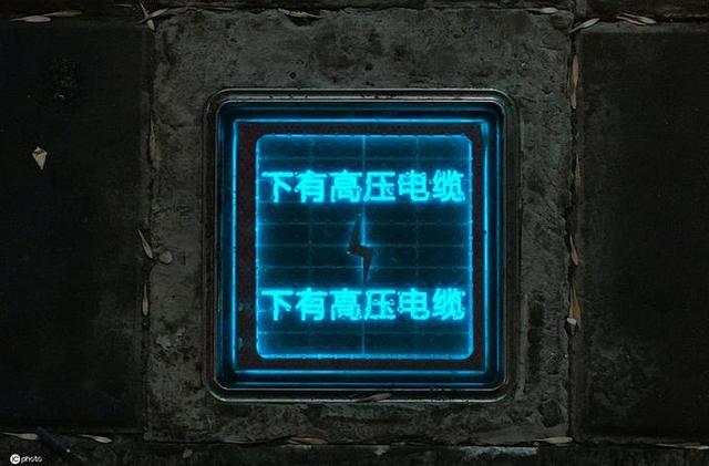 2021年1月20日,辽宁省沈阳市,和平区首条高压电缆地面标识亮相街头,夜晚被唤醒点亮,蓝屏醒目来往经过的市民低头一看,下有高压电缆提示。