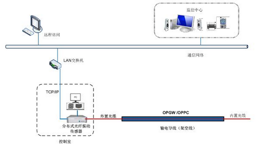 系统主要由探测光纤、分布式光纤振动传感器和监测主机等组成。其中探测光纤采用OPGW或OPPC内部的一根单模光纤;分布式光纤振动传感器和监测主机设置在架空线路一端的监控室内。监测主机为PC机,运行计算和监测进程,提供监测视图,并可通过通信网络传送至监控中心或被远程访问。